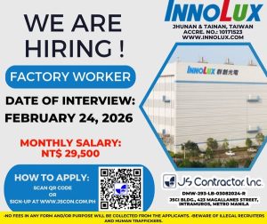 Taiwan — Innolux Corporation, a global leader in display technology, is currently hiring Factory Workers bound to Taiwan. This overseas employment opportunity is open to qualified Filipino applicants and is processed exclusively through JS Contractor, Inc., a licensed recruitment agency.