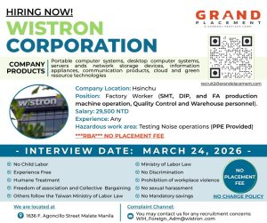 Are you looking for a stable opportunity in the manufacturing industry? Wistron Corporation, a global electronics manufacturer, is now hiring Factory Workers for its operations in Hsinchu, Taiwan.