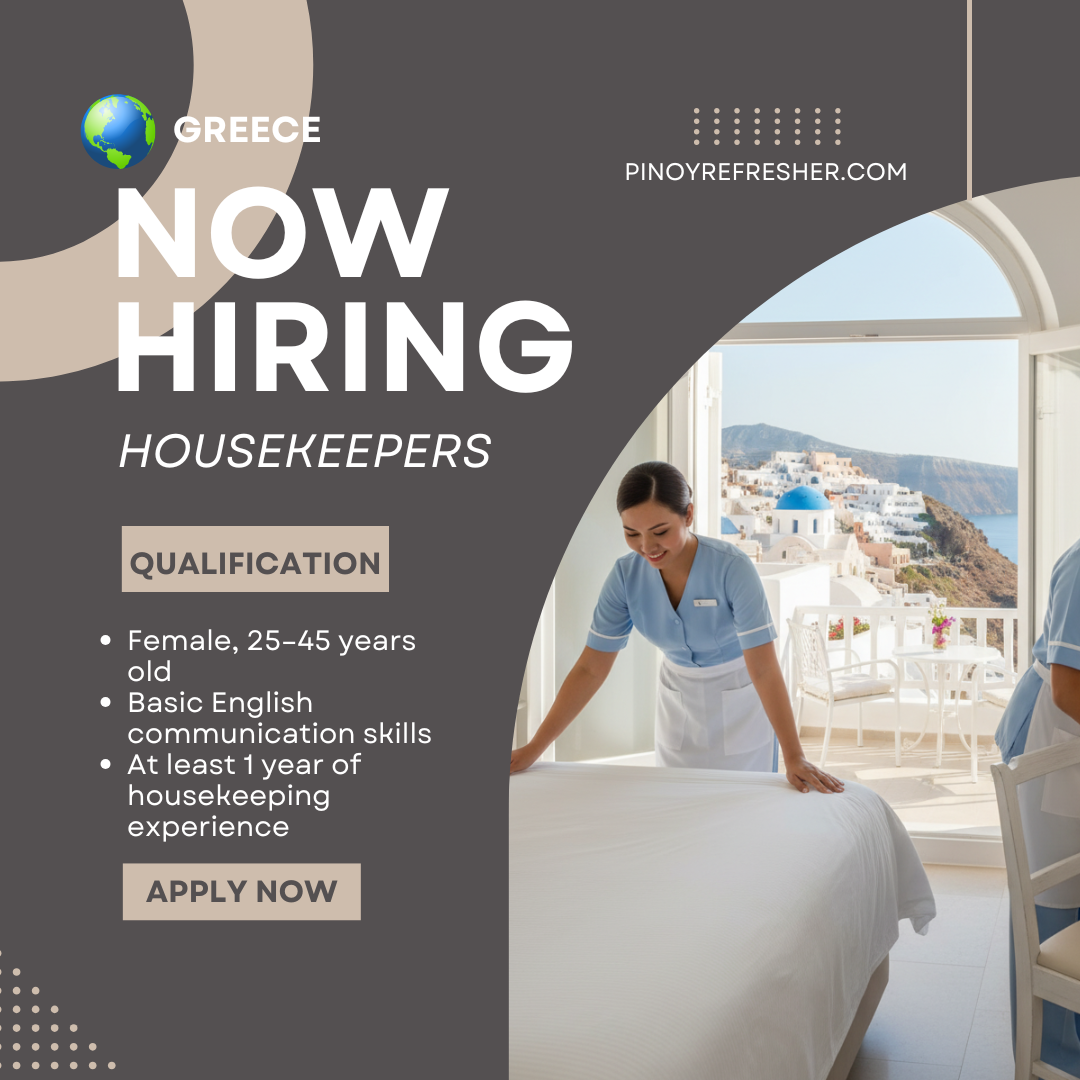 Golden Legacy Jobmovers Corp. is now accepting applications for Female Housekeepers bound for Greece. If you are dedicated, reliable, and ready to start a new chapter overseas, this job is perfect for you!