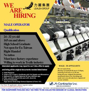 JS Contractor is urgently looking for male applicants for Taiwan deployment in manufacturing/factory roles.