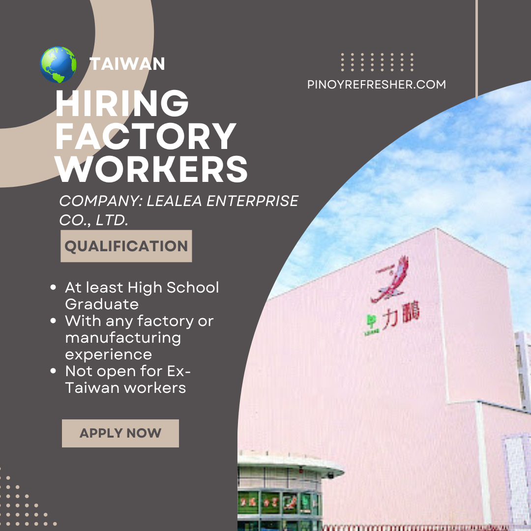 JS Contractor is urgently looking for male applicants for Taiwan deployment in manufacturing/factory roles.