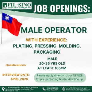 Don’t miss this opportunity! Apply now and take the first step toward a rewarding career in manufacturing with Fil-Sino Manpower Services Inc.