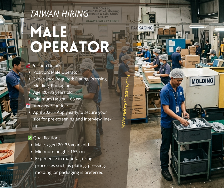 Don’t miss this opportunity! Apply now and take the first step toward a rewarding career in manufacturing with Fil-Sino Manpower Services Inc.