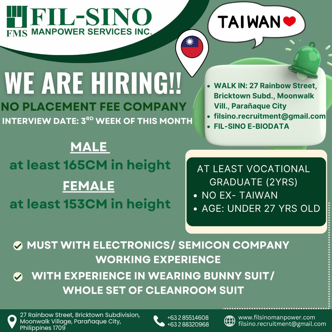 HIRING! – Operator Positions (Male & Female) at FIL-SINO Manpower Services Inc.