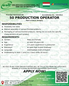 Are you ready to take your career overseas? EMS Services International, Inc., in partnership with Pannonjob Kft., is now accepting applications for 50 Production Operators bound for Hungary. This is an excellent opportunity for hardworking Filipinos seeking stable employment with a reputable international employer.