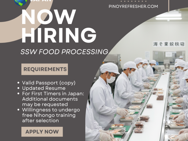 -N4 passer / Japanese Language Proficiency Test or JFT Passer. Interested and willingness to work in Japan.