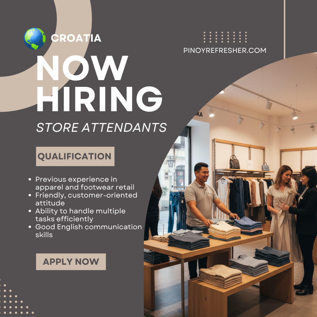 Are you passionate about fashion and customer service? Do you have experience in apparel and footwear retail? Premier Global Recruitment is now hiring Store Attendants for employment opportunities in Croatia. This is an excellent chance to work abroad, gain international experience, and enjoy a rewarding career in the retail industry — all with a transparent process and no placement fees.