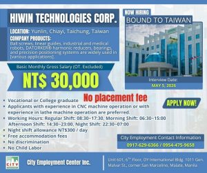 Filipino job seekers are encouraged to apply as HIWIN Technologies Corp. opens manpower pooling for factory positions bound for Taiwan. The recruitment offers opportunities for skilled applicants to work in multiple industrial locations including Yunlin, Chiayi, and Taichung.