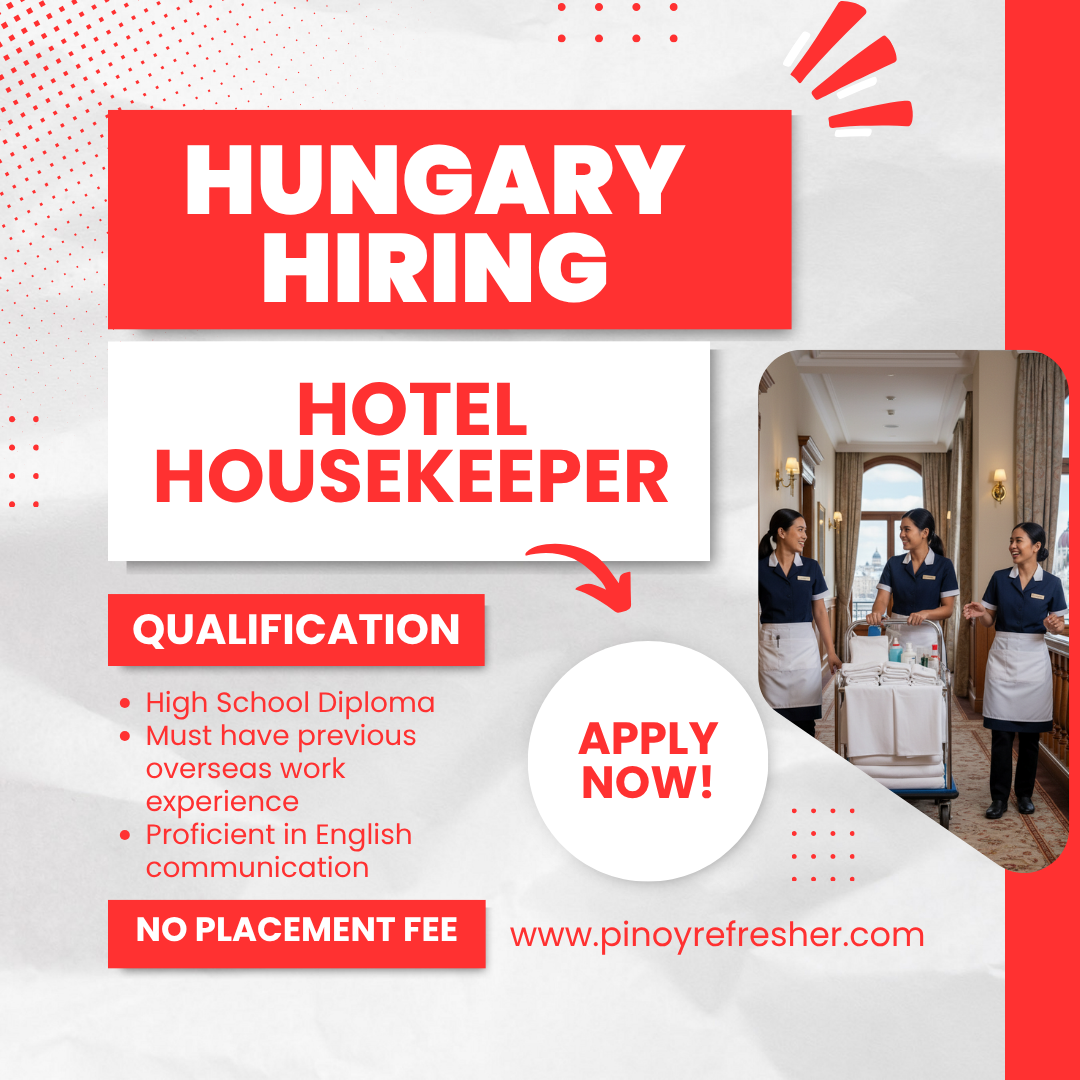 PHILORE Manpower Corporation is now hiring experienced Hotel Housekeepers for Hungary! If you have international housekeeping experience and a passion for maintaining high hospitality standards, this opportunity is for you.