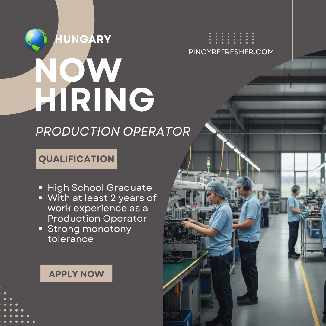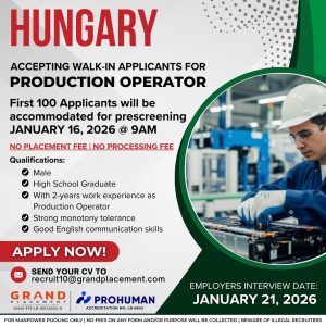 A leading employer in Hungary is now accepting walk-in applicants for the position of Production Operator. This opportunity is being offered through Grand Placement & General Services Corp., a DMW-licensed recruitment agency, in partnership with Prohuman, an accredited employer.