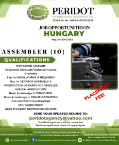 Manila, Philippines β Filipino job seekers looking for overseas opportunities can now apply for assembly work in Hungary as Peridot International Resources Inc. announces manpower pooling for 10 Assemblers in the manufacturing sector. ππΊπΌ