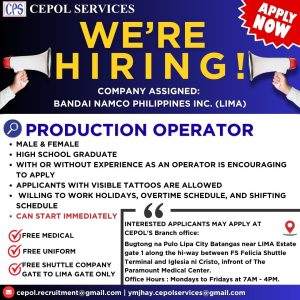 CEPOL SERVICES has announced urgent and immediate hiring for Production Operators assigned to its client, Bandai Namco Philippines Inc. located in LIMA Estate.