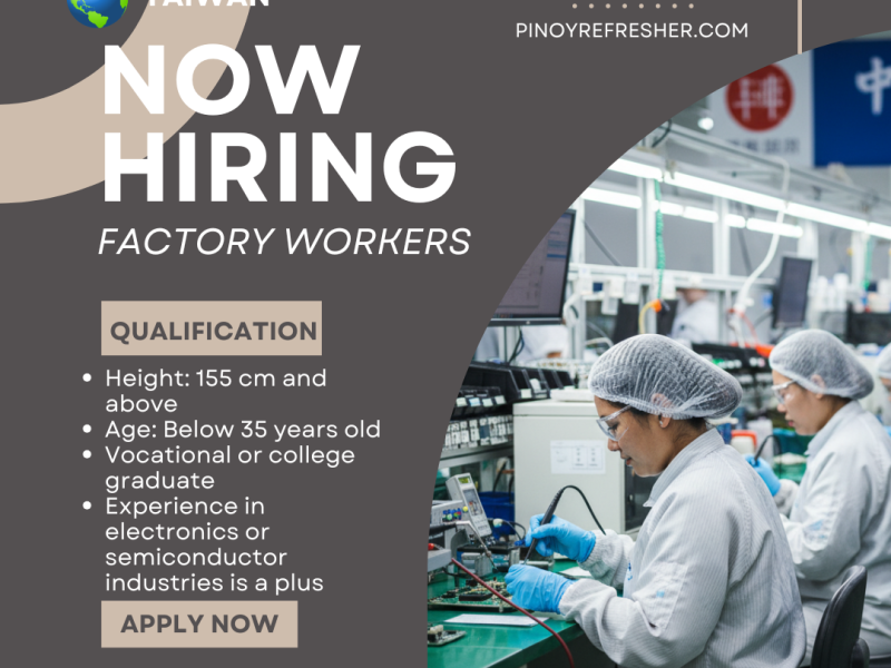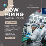 Apply now as a Factory Worker in Taiwan! Both Male and Female applicants are welcome.