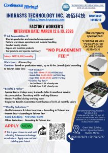 Are you looking for a stable overseas job opportunity with a leading Taiwanese technology manufacturer? Ingrasys Technology Inc. is now accepting applications for Factory Workers, offering competitive pay, structured benefits, and long-term career growth in the electronics manufacturing industry.