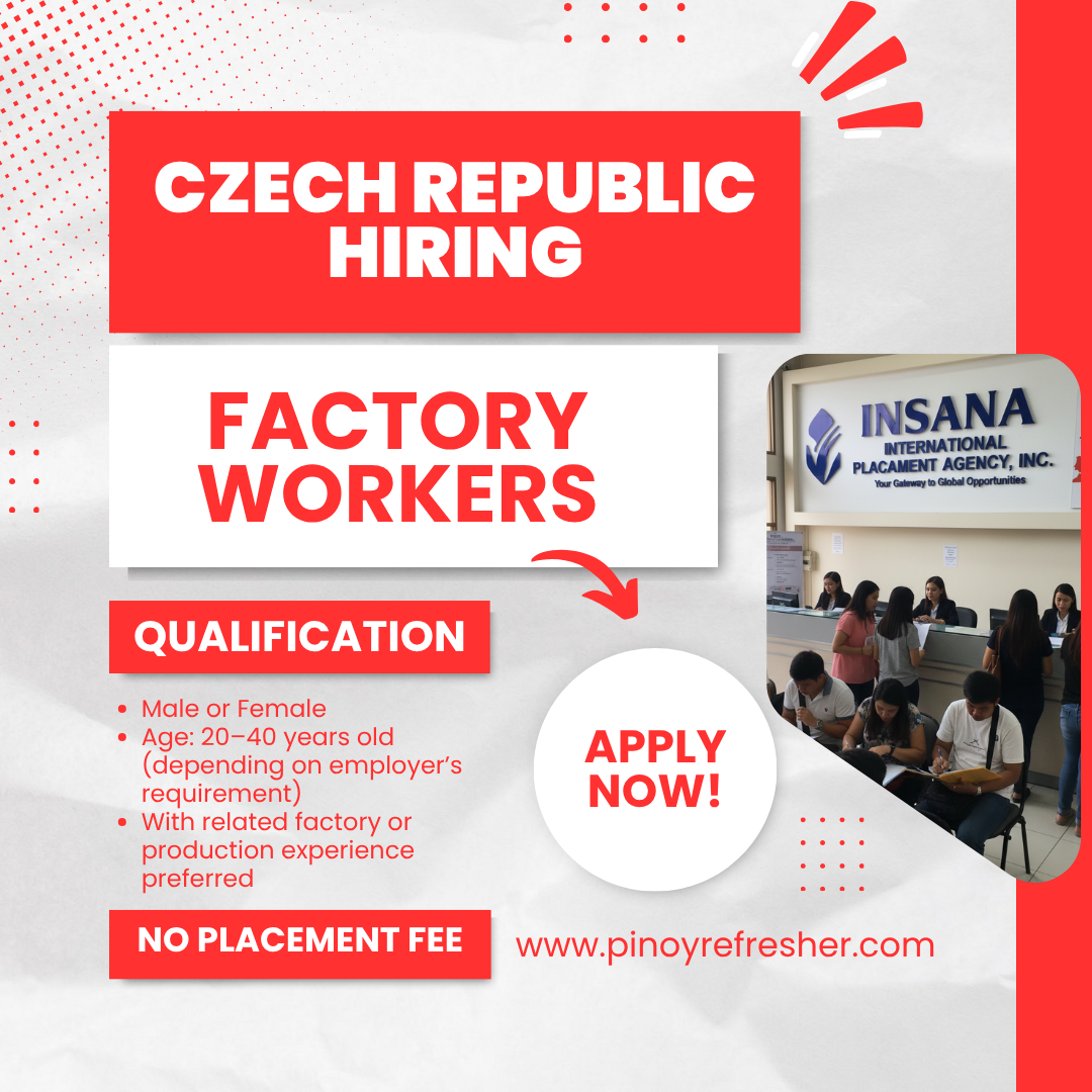 Insana International Placement Agency, Inc. is now accepting qualified applicants for Czech Republic under reputable European employers. Get the chance to work legally overseas with no placement fee and build a stable career in one of Europeβs most promising industrial countries.