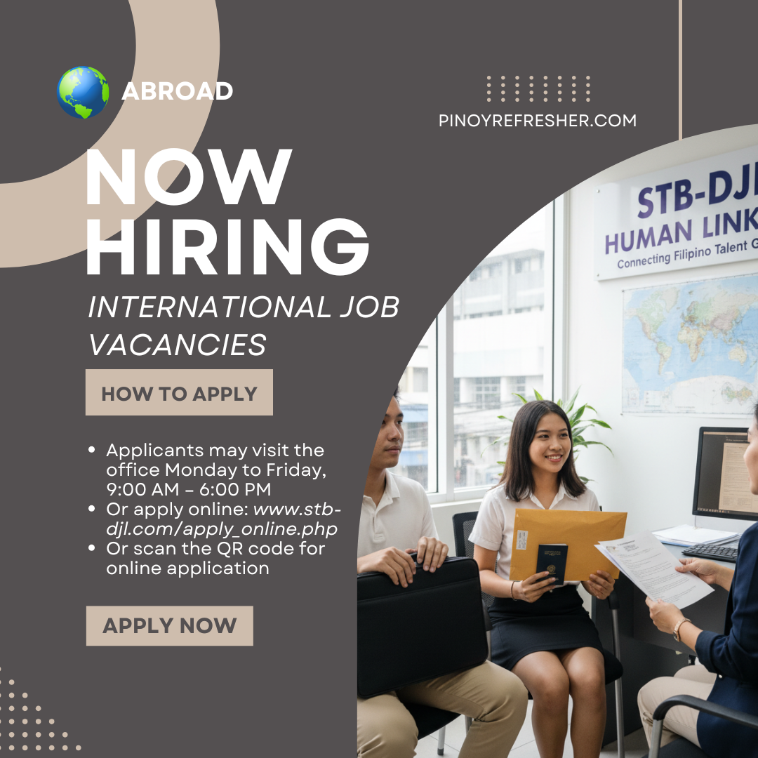 STB-DJL Human Link Inc. is hiring for multiple international positions across various countries. Qualified applicants are encouraged to visit their office or apply online.