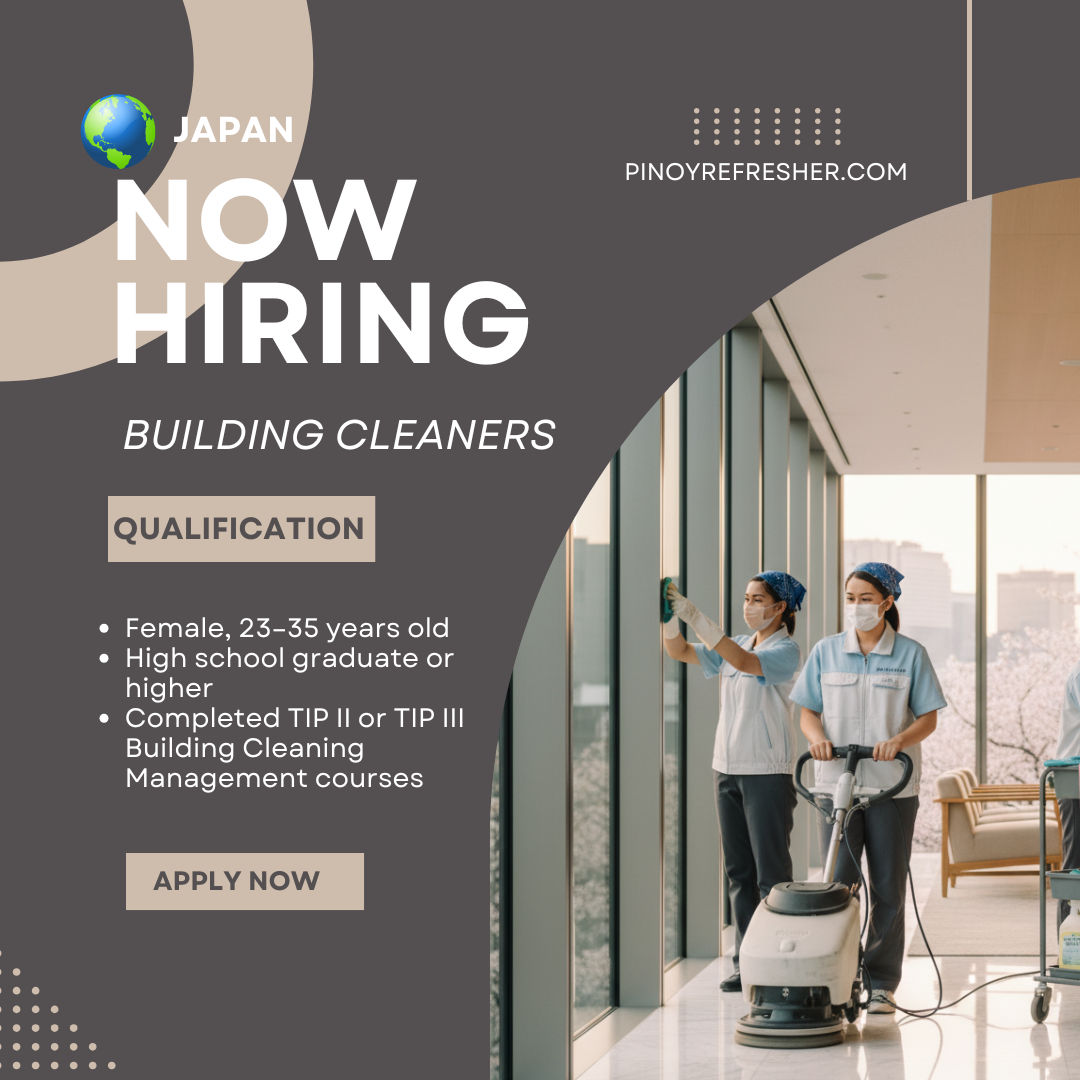The position is for Building Cleaners bound for Japan under the accreditation of Tsuyama Biru Kanri Co., Ltd. Successful applicants will be responsible for maintaining cleanliness, sanitation, and facility upkeep in various buildings.