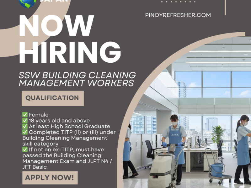 -Willing to undergo Nihongo Training-Interest and Willingness to work in Japan for a maximum of 3 years (depending on Job Orders)