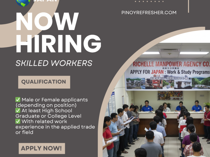 Magandang araw Kabayan, salamat sa inyong pagbisita sa Pinoy Refresher’s website. Nais lamang po namin linawin na ang Pinoy Refresher ay WALANG AGENT at kailan man ay hindi kami naging agent ng mga agency at kahit Piso ay hindi po kami naniningil, Libre po ang aming serbisyo para sa mga Kababayan natin. Hindi rin kami affiliated sa mga Agencies bound to Taiwan at Japan.