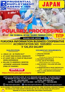 Young Filipino males have a new overseas opportunity as a reputable employment agency opens applications for poultry processing positions in Japan under the Technical Intern Trainee Program (TITP). This program offers competitive pay, free Japanese language training, and valuable international work experience.