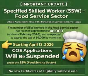The Immigration Services Agency of Japan has announced a temporary suspension of Certificate of Eligibility (COE) applications for Skilled Workers (SSW) in the Food Service Sector, effective April 13, 2026. This move comes amid a growing influx of foreign workers supporting Japan’s food service industry.
