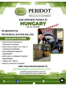 ParaΓ±aque City, Philippines β Peridot International Resources Inc. has announced a new overseas job opportunity for Filipino workers, opening 20 vacancies for Warehouse Material Handlers bound for Hungary. ππΊβ¨