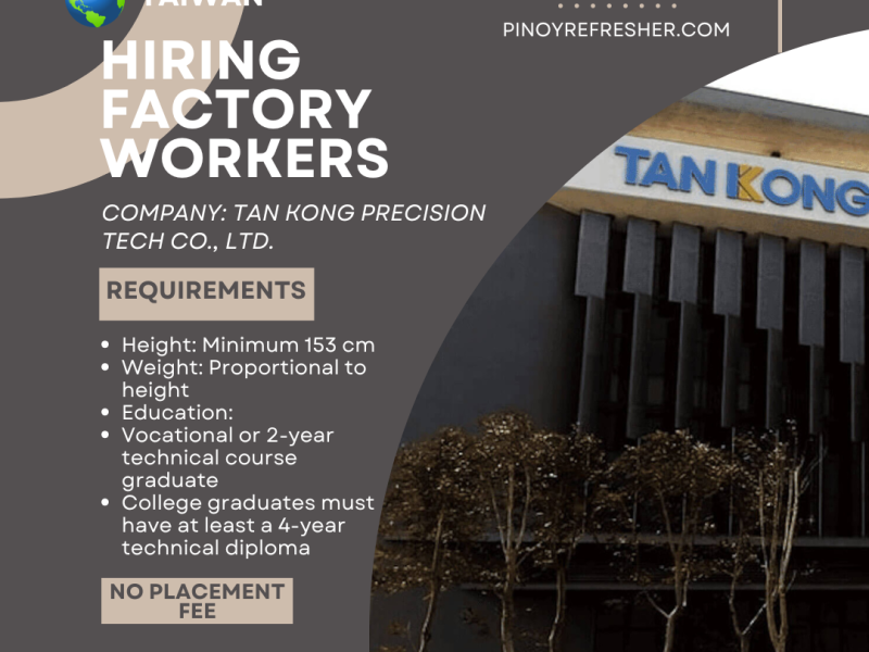 Looking to work abroad and create a better future for yourself and your family? Japan Maruko International Corporation is now accepting applications for factory workers for deployment to Taiwan. This is a fantastic opportunity for individuals seeking international work experience, competitive pay, and career growth in the manufacturing industry.