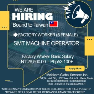 Melakom Global Services Inc. is now hiring Factory Workers bound for Taiwan! This is your chance to build a better future with a reputable employer through a safe and legal recruitment process.