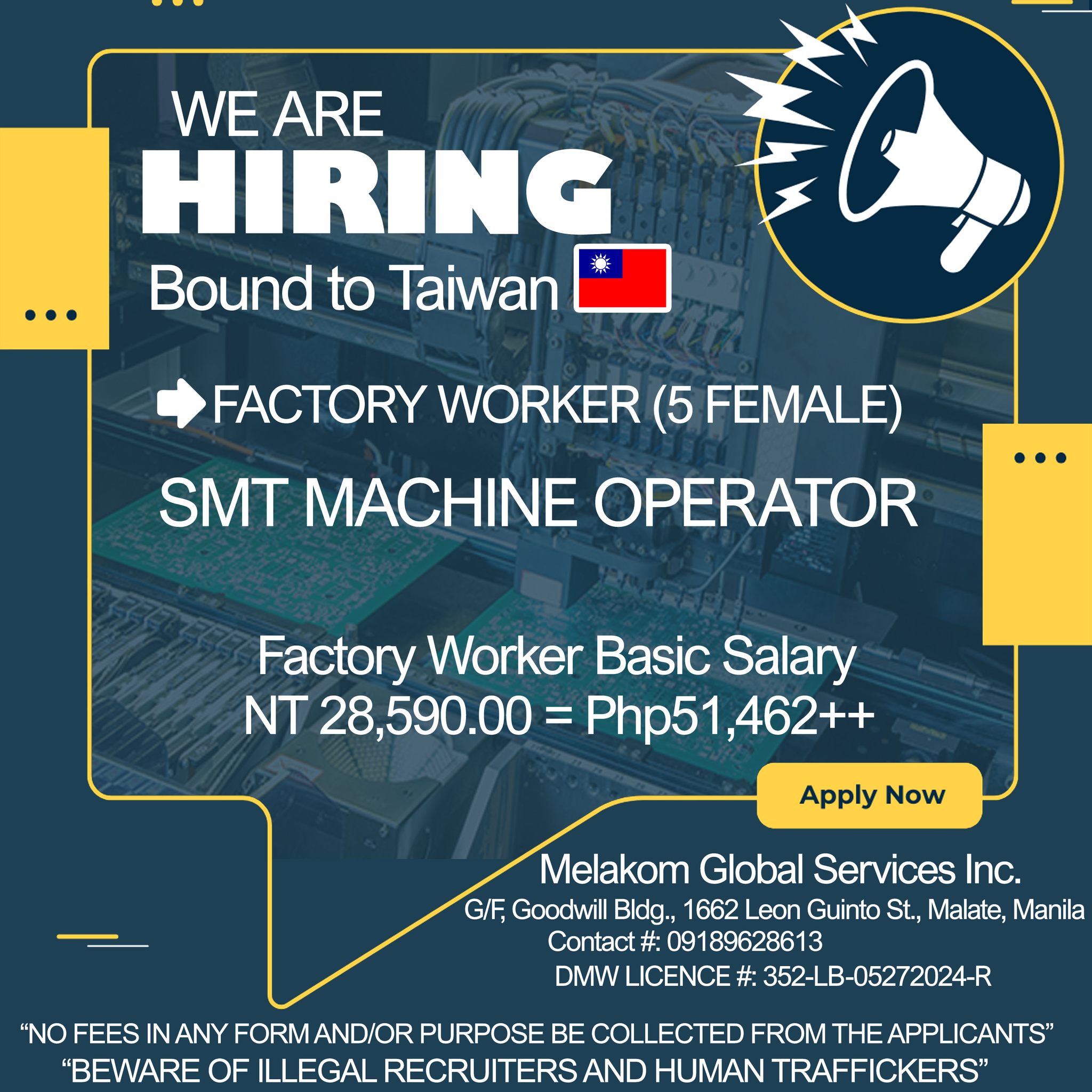 Melakom Global Services Inc. is now accepting applicants for Factory Workers (5 Female) to be deployed in Taiwan as SMT Machine Operators.