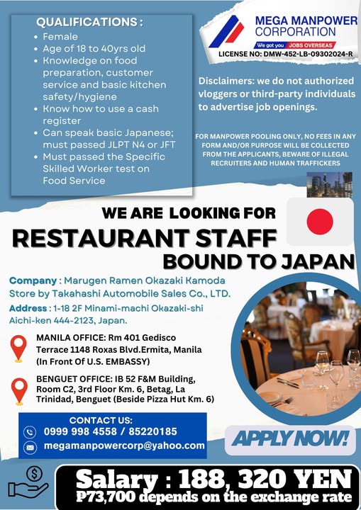 Are you passionate about the food industry and eager to experience life in Japan? Mega Manpower Corporation is looking for dedicated individuals to join their partner companies in Japan as Restaurant Staff.