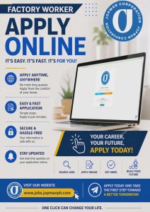 Aspiring factory workers now have a faster and more convenient way to apply for jobs as JOPMAN Corporation officially launches its online application system. This initiative allows applicants to submit their credentials Ψ¨Ψ³ΩΩΩΨ© anytime and anywhereβmaking job hunting easier and more accessible for everyone πβ¨.