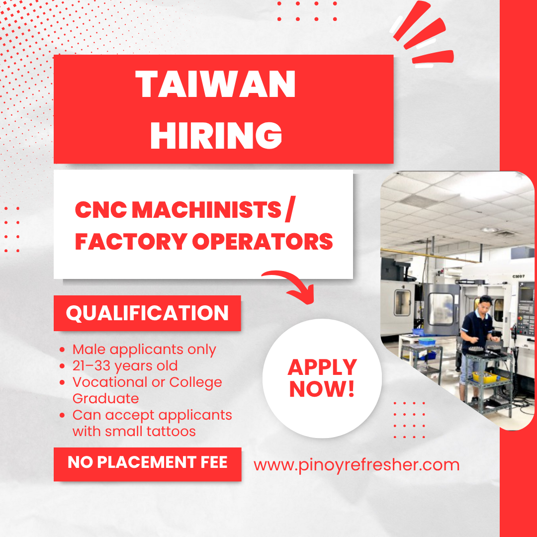 Our client in Taiwan β National Aerospace Fastener Corporation (NAFCO) β is urgently hiring Male Factory Operators / CNC Machinists to join their growing team in Taoyuan, Taiwan!