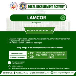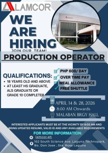 A new employment opportunity is opening for local job seekers as Lamcor announces a one-day recruitment drive for Production Operators in Laguna Technopark.