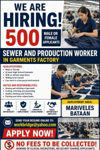 Massive Hiring in Bataan: 500 Sewers & 500 Production Workers Needed in Mariveles