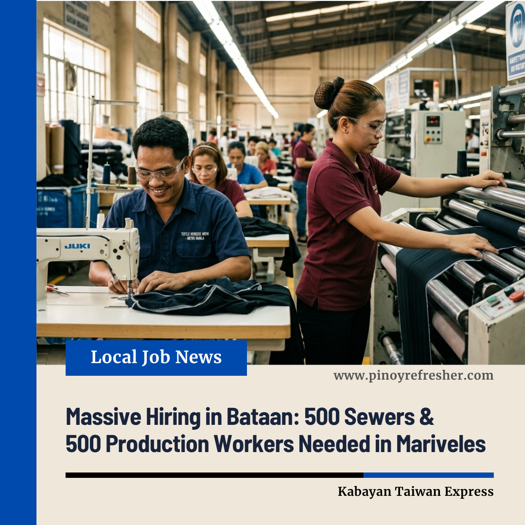 Job seekers in Central Luzon have a huge employment opportunity as a manufacturing company opens large-scale hiring for 1,000 workers in Mariveles, Bataan. The recruitment drive is looking for 500 Sewers and 500 Production Workers, open to both male and female applicants πŸ‘·β€β™‚οΈπŸ‘·β€β™€οΈ.