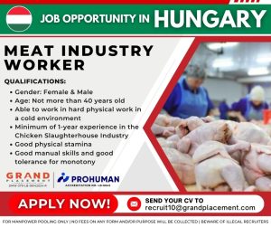 Filipino job seekers are being invited to apply for Meat Industry Worker positions bound for Hungary, as Grand Placement & General Services Corp. announces new manpower pooling opportunities under a licensed recruitment program.