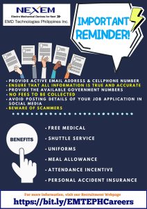NEXEM EMD Technologies Philippines Inc., a leading provider of electro-mechanical devices, has announced a new wave of recruitment for Production Operators for its manufacturing facilities in Southern Luzon, alongside important reminders for applicants to ensure a smooth and secure hiring process.