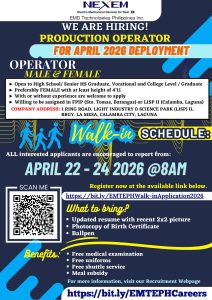 NEXEM EMD Technologies Philippines Inc. is actively hiring Production Operators with walk-in interviews scheduled from April 22 to April 24, 2026 at 8:00 AM.