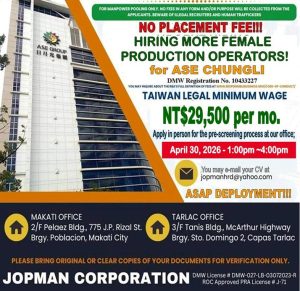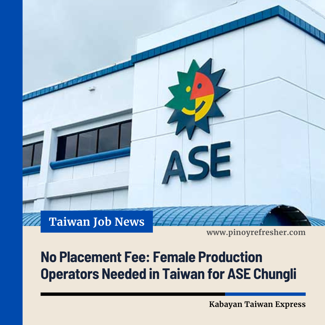 Philippines — Filipino job seekers aiming to work abroad now have a promising opportunity as a licensed recruitment agency announces hiring for Female Production Operators bound for Taiwan. The deployment will be for ASE Chungli, a globally recognized player in the semiconductor industry.