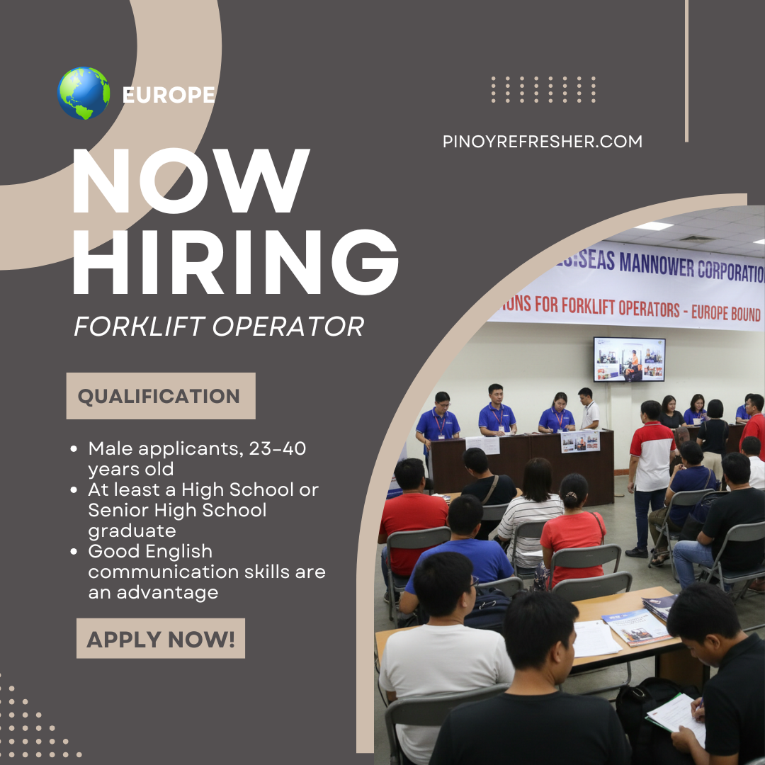 Proactive Overseas Manpower Corporation is now accepting applications for Forklift Operator positions bound for Europe. This is your chance to gain global experience and work with trusted companies abroad.