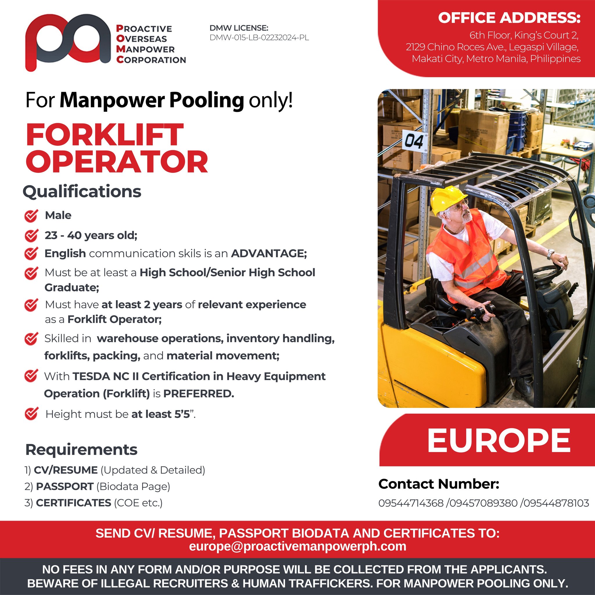 Take the next step in your career—Apply now as a Forklift Operator in Europe with Proactive Overseas Manpower Corporation and build your future abroad! 🌍