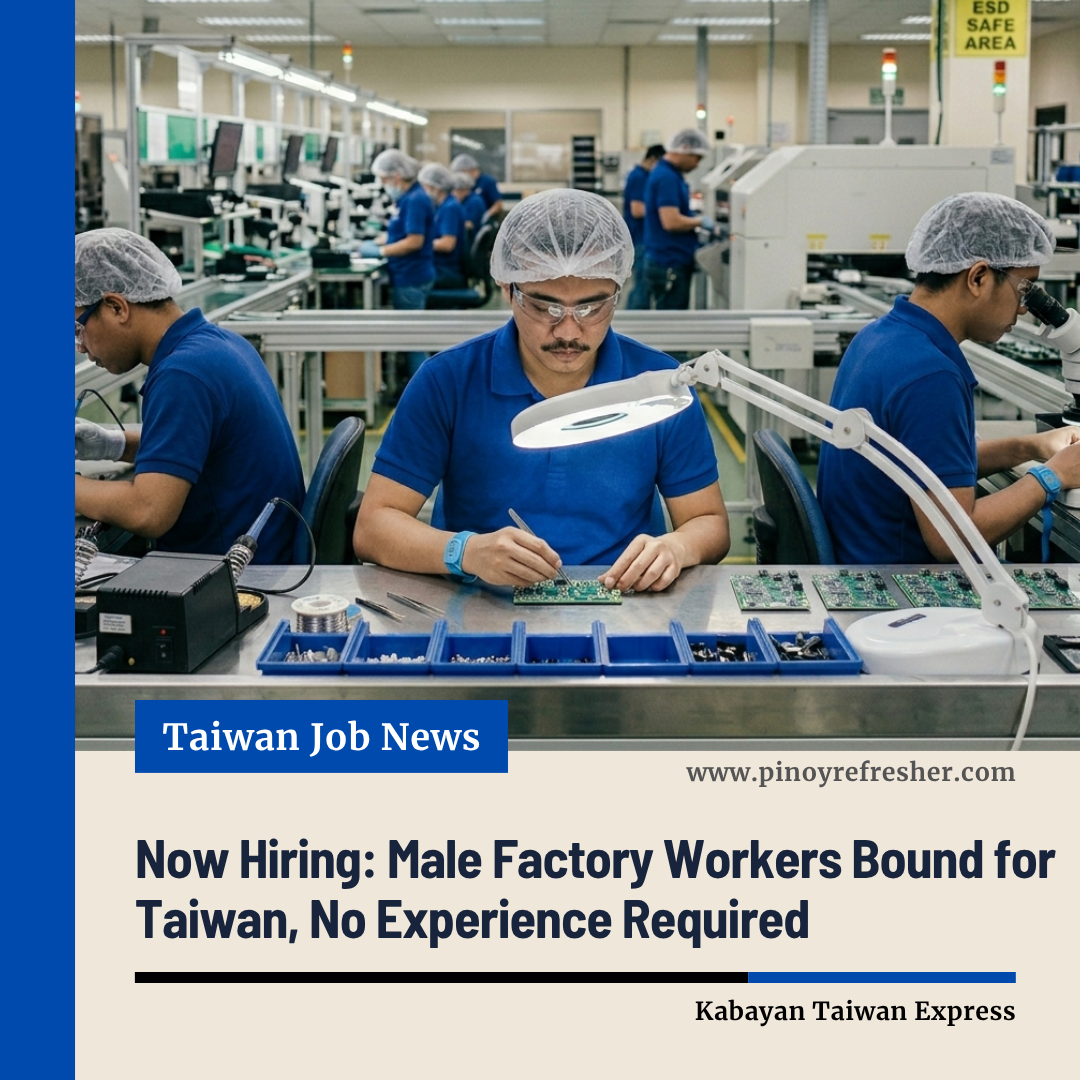Cebu, Philippines β A new overseas job opportunity has opened for Filipino workers as a recruitment agency begins accepting applicants for Male Factory Workers bound for Taiwan. This hiring is open to both first-time applicants and returning workers, offering a chance to work abroad even without prior factory experience. πΌβ¨