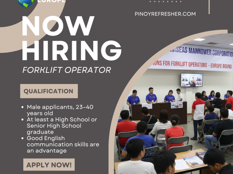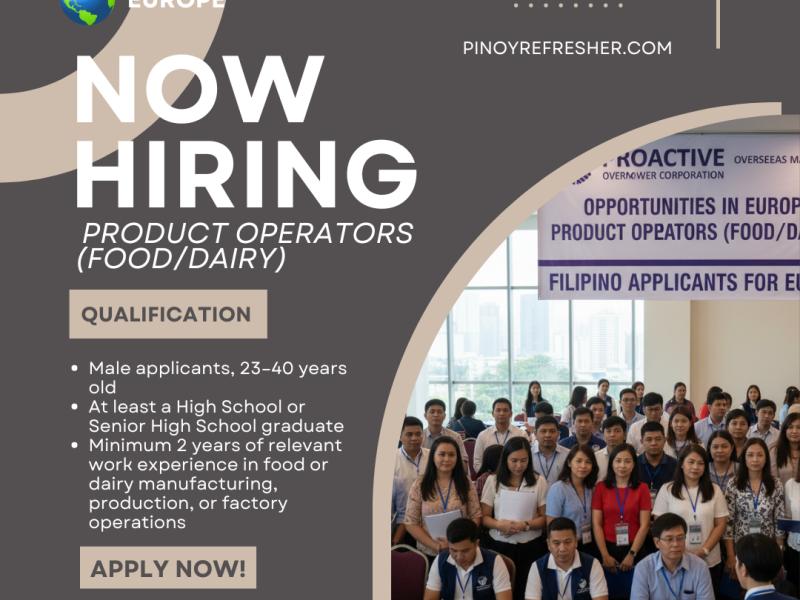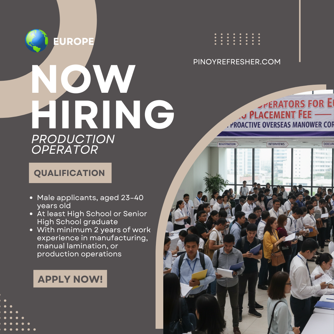 Proactive Overseas Manpower Corporation is now accepting applicants for the position of Production Operator bound for Europe. This is your chance to work with a respected employer and gain valuable global experience.