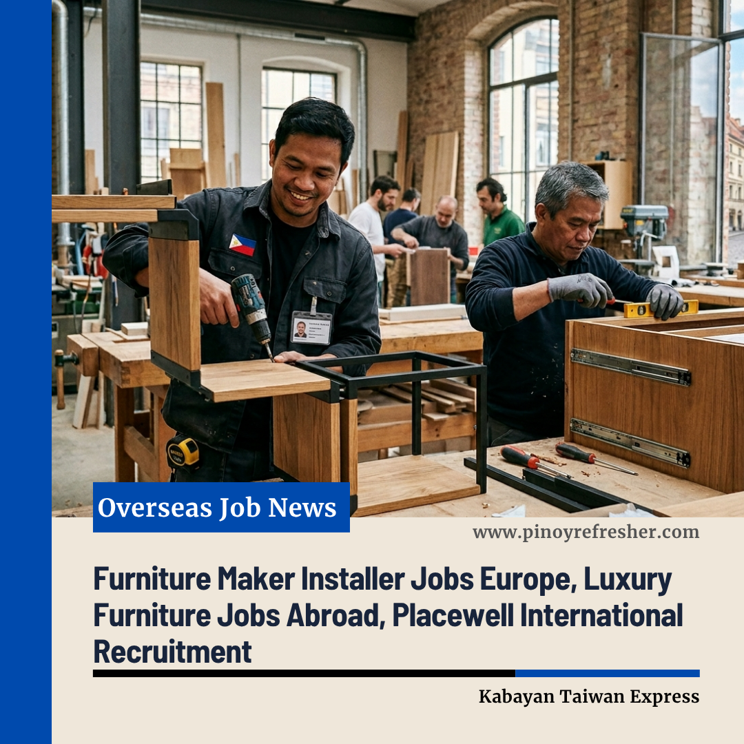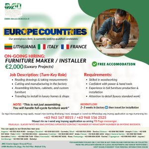 Manila, Philippines – Placewell International Services Corporation is now hiring Furniture Makers / Installers for luxury projects in Lithuania, Italy, and France. The positions offer a competitive €2,000 net salary and free accommodation, providing skilled Filipino workers the opportunity to work on high-end furniture projects abroad.