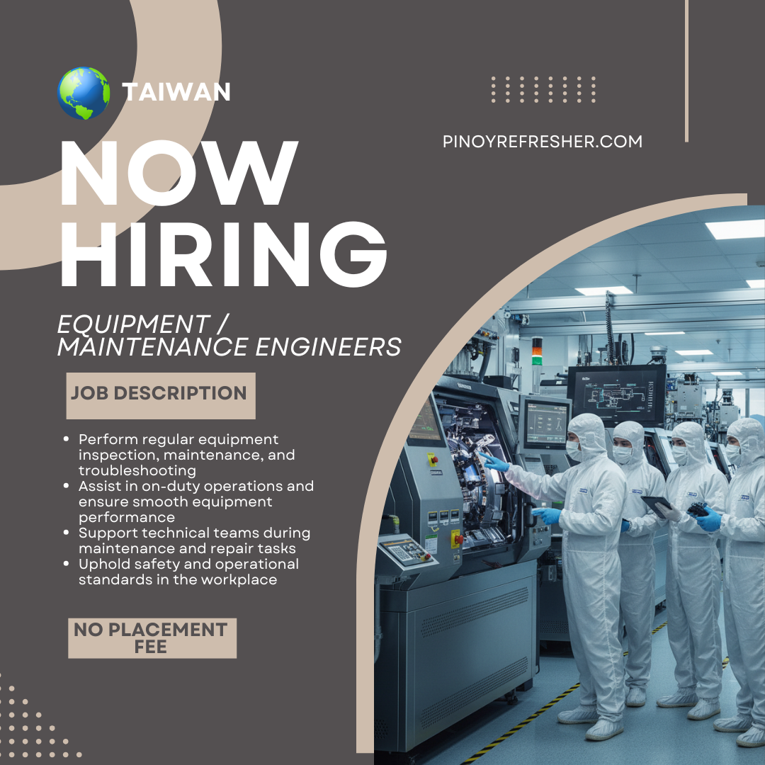 Now Hiring: Equipment / Maintenance Engineers for Taiwan (Zero Placement Fee) Agency: Workforce International Inc.DMW License No.: DMW-423-LB-08162024-R Workforce International Inc., a DMW-accredited recruitment agency,