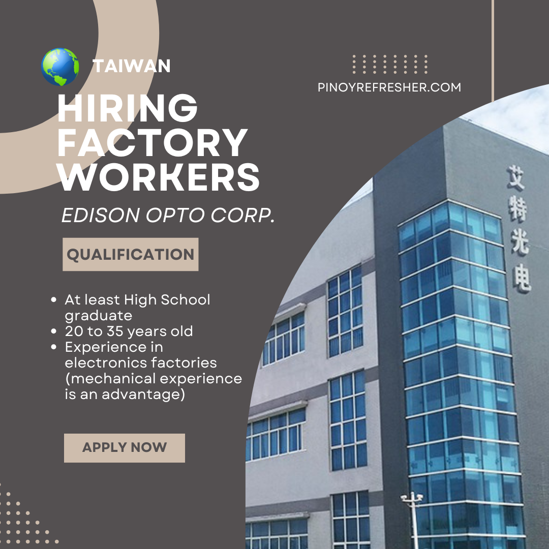🏭 Now Hiring: Factory Workers in Taiwan 📍 Job Location: Taiwan💰 Salary: NT$29,500 About the Company Edison Opto Corporation – Established in October 2001, Edison