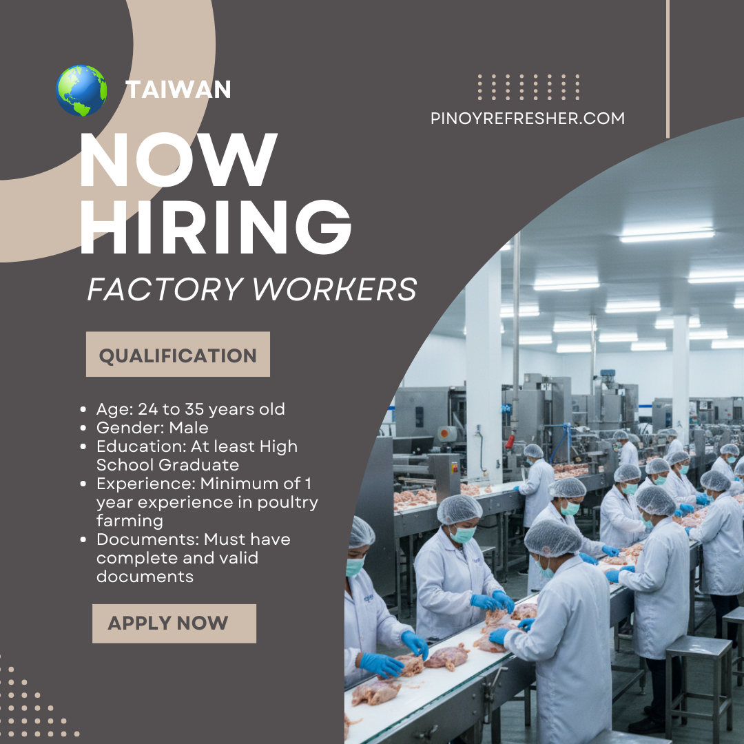๐จ RUSH HIRING: Factory Workers โ Accton Technology Corporation, Taiwan FIL-SINO Manpower Services Inc. is urgently hiring factory workers for Accton Technology Corporation in Hsinchu,