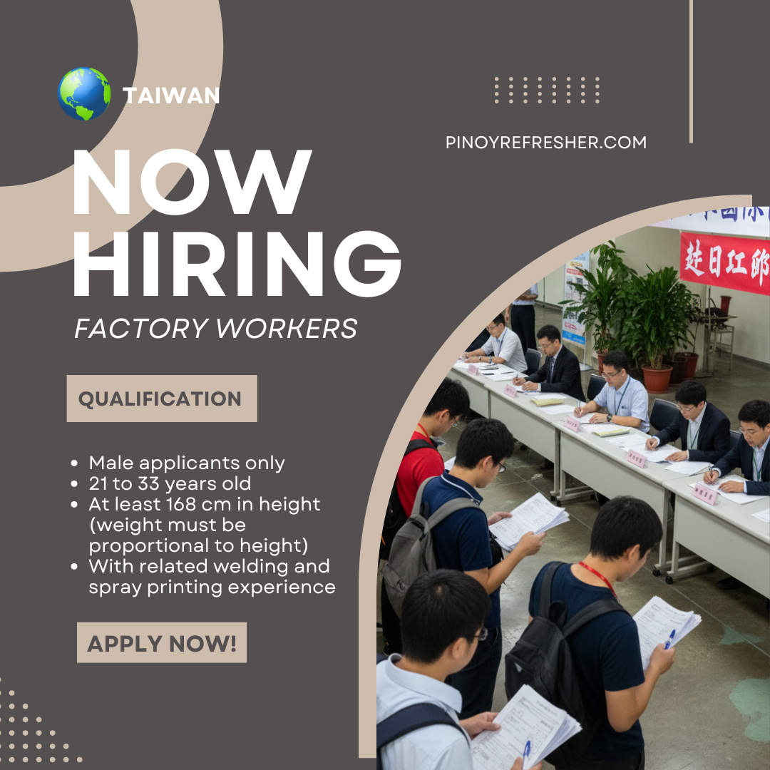 Urgent Hiring Factory Worker Job Location: Taipei, Taiwan Company: Inteplast Taiwan Corporation Salary: NT$28,590 ONE (1) MALE FACTORY WORKERS GROSS MONTHLY SALARY: NT$ 28,590 QUALIFICATIONS: