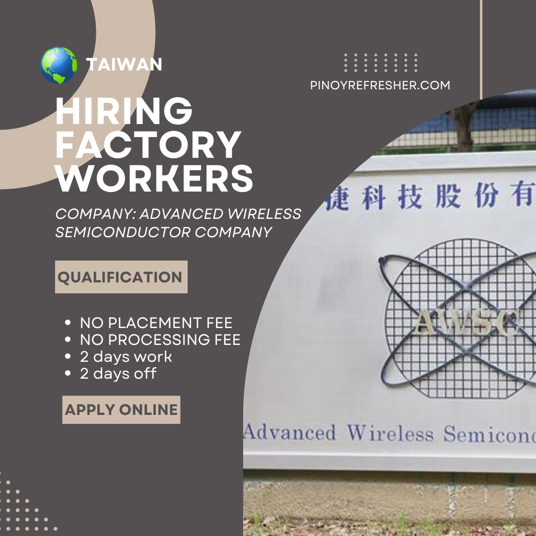 URGENT HIRING BOUND TO TAIWAN BASIC SALARY: NT$ 27,470 (PHP 49,000+) QUALIFICATION FEMALE AGE: 20 – 30 YEARS OLD HEIGHT: 160 CM ABOVE WEIGHT: 50