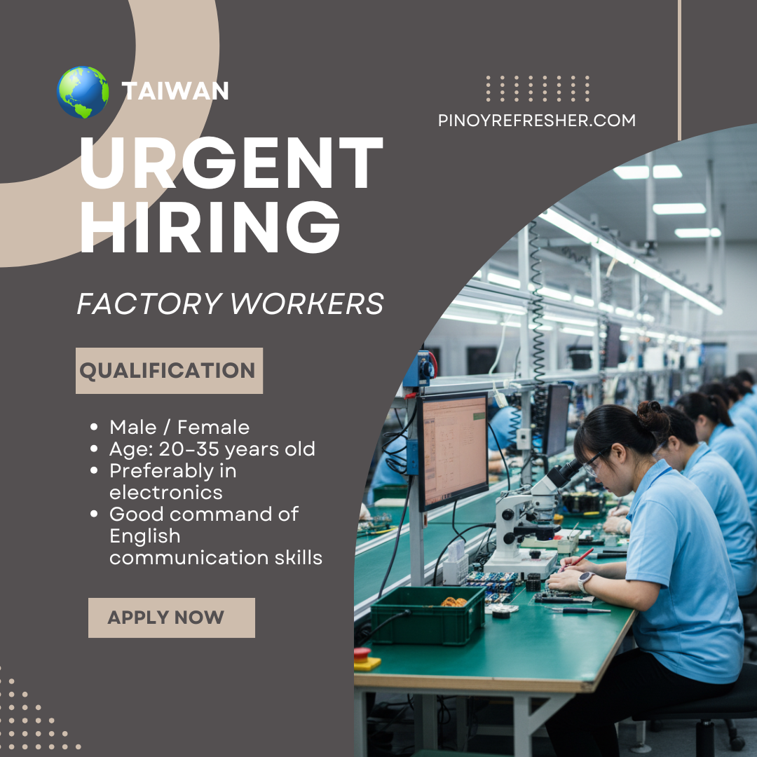 🔴 Urgent Hiring: Female Factory Workers for Taiwanese Companies 🇹🇼 A number of reputable Taiwanese companies are urgently seeking qualified female factory workers for immediate